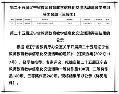 中国近现代史纲要教研室王建宇老师微课:《论<历史终结论>的终结》在第二十五届辽宁省教师教育教学信息化交流活动高等教育组荣获微课类三等奖。该比赛于2021年5月起开展,根据《辽宁省教育厅办公室关于举办辽宁省第二十五届教育教学信息化交流活动的通知》,我校组织了“第二十五届辽宁省教师教育教学信息化交流活动”作品校内评选,并按要求报送相关作品。本次获奖作品报送国家平台交流展示。