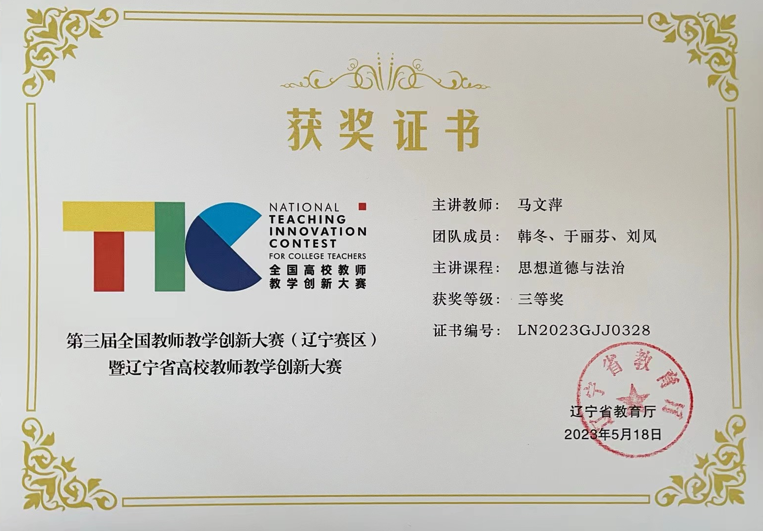 近日,辽宁省教育厅公布2023年辽宁省高校教师教学创新大赛获奖名单,蘑菇视频 “思想道德与法治”课程教师团队获得三等奖,团队成员包括马文萍、韩冬、于丽芬和刘凤4位教师。