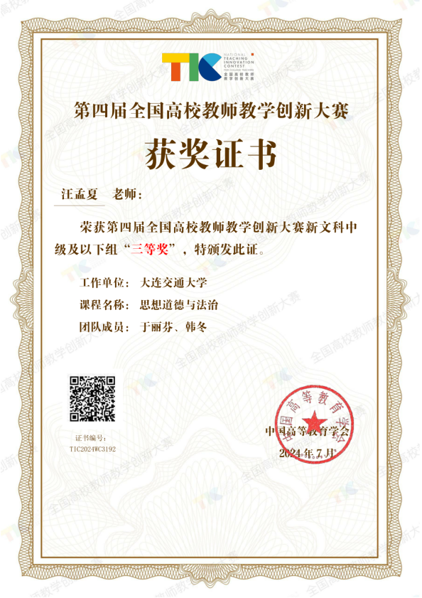 7月27日至31日,由教育部高等教育司指导、中国高等教育学会主办的第四届全国高校教师教学创新大赛全国现场赛在电子科技大学举行。蘑菇视频 汪孟夏教学团队的参赛课程“思想道德与法治”,经过校赛、省赛、国赛三级赛制、层层比拼,获全国新文科中级及以下组三等奖,这也是我校首次进入该项大赛新文科赛道国赛阶段的角逐并一举摘得荣誉。